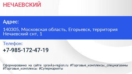 НЕЧАЕВСКИЙ по адресу 140305, Московская область, Егорьевск, территория Нечаевский снт, 1 в дальнейшем Организация, размещена в следующих категориях: