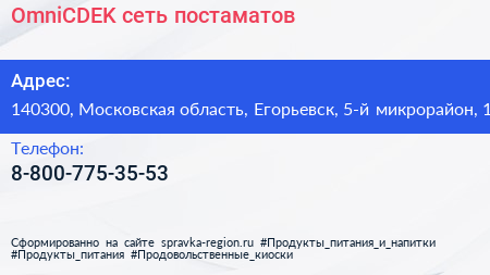 OmniCDEK, сеть постаматов по адресу 140300, Московская область, Егорьевск, 5-й микрорайон, 1 в дальнейшем Организация, размещена в следующих категориях: