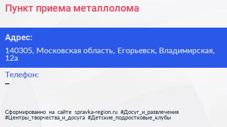 Пункт приема металлолома по адресу 140305, Московская область, Егорьевск, Владимирская, 12а в дальнейшем Организация, размещена в следующих категориях: