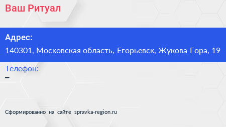 Ваш Ритуал по адресу 140301, Московская область, Егорьевск, Жукова Гора, 19 в дальнейшем Организация, размещена в следующих категориях: