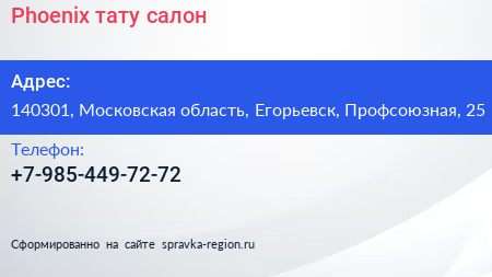 Phoenix, тату-салон по адресу 140301, Московская область, Егорьевск, Профсоюзная, 25 в дальнейшем Организация, размещена в следующих категориях: