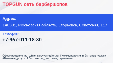 TOPGUN, сеть барбершопов по адресу 140301, Московская область, Егорьевск, Советская, 117 в дальнейшем Организация, размещена в следующих категориях: