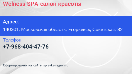 Welness SPA, салон красоты по адресу 140301, Московская область, Егорьевск, Советская, 82 в дальнейшем Организация, размещена в следующих категориях:
