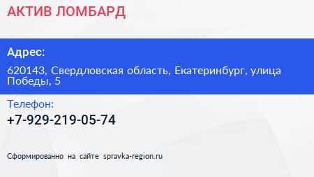 АКТИВ ЛОМБАРД по адресу 620143, Свердловская область, Екатеринбург, улица Победы, 5 в дальнейшем Организация, размещена в следующих категориях: