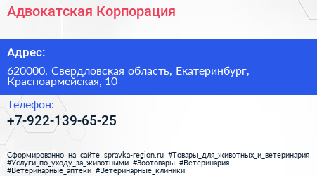 Адвокатская Корпорация по адресу 620000, Свердловская область, Екатеринбург, Красноармейская, 10 в дальнейшем Организация, размещена в следующих категориях: