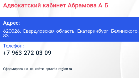 Адвокатский кабинет Абрамова А.Б. по адресу 620026, Свердловская область, Екатеринбург, Белинского, 83 в дальнейшем Организация, размещена в следующих категориях: