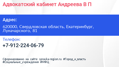 Адвокатский кабинет Андреева В.П. по адресу 620000, Свердловская область, Екатеринбург, Луначарского, 81 в дальнейшем Организация, размещена в следующих категориях: