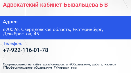 Адвокатский кабинет Бывальцева Б.В. по адресу 620026, Свердловская область, Екатеринбург, Декабристов, 45 в дальнейшем Организация, размещена в следующих категориях: