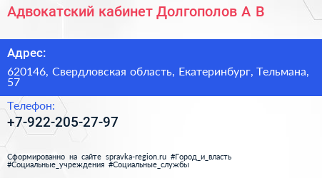 Адвокатский кабинет Долгополов А.В. по адресу 620146, Свердловская область, Екатеринбург, Тельмана, 57 в дальнейшем Организация, размещена в следующих категориях: