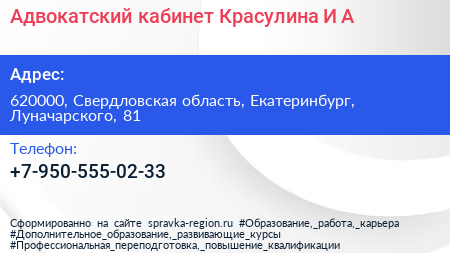 Адвокатский кабинет Красулина И.А. по адресу 620000, Свердловская область, Екатеринбург, Луначарского, 81 в дальнейшем Организация, размещена в следующих категориях: