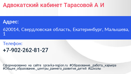 Адвокатский кабинет Тарасовой А.И. по адресу 620014, Свердловская область, Екатеринбург, Малышева, 1 в дальнейшем Организация, размещена в следующих категориях: