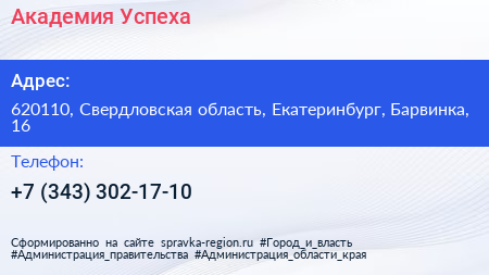 Академия Успеха по адресу 620110, Свердловская область, Екатеринбург, Барвинка, 16 в дальнейшем Организация, размещена в следующих категориях: