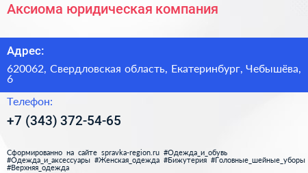 Аксиома, юридическая компания по адресу 620062, Свердловская область, Екатеринбург, Чебышёва, 6 в дальнейшем Организация, размещена в следующих категориях:
