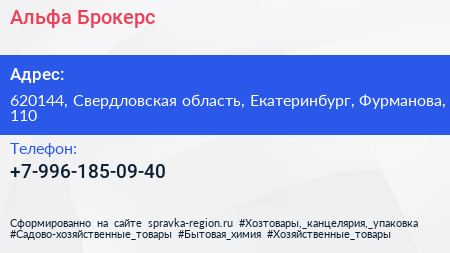 Альфа Брокерс по адресу 620144, Свердловская область, Екатеринбург, Фурманова, 110 в дальнейшем Организация, размещена в следующих категориях: