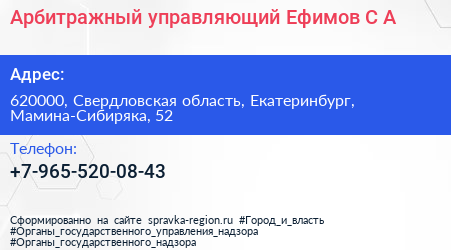 Арбитражный управляющий Ефимов С.А. по адресу 620000, Свердловская область, Екатеринбург, Мамина-Сибиряка, 52 в дальнейшем Организация, размещена в следующих категориях: