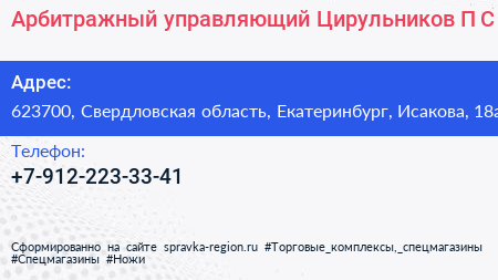 Арбитражный управляющий Цирульников П.С. по адресу 623700, Свердловская область, Екатеринбург, Исакова, 18а в дальнейшем Организация, размещена в следующих категориях: