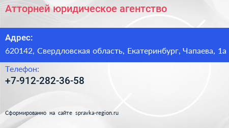 Атторней, юридическое агентство по адресу 620142, Свердловская область, Екатеринбург, Чапаева, 1а в дальнейшем Организация, размещена в следующих категориях: