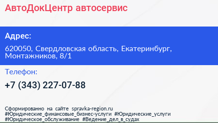 АвтоДокЦентр, автосервис по адресу 620050, Свердловская область, Екатеринбург, Монтажников, 8/1 в дальнейшем Организация, размещена в следующих категориях:
