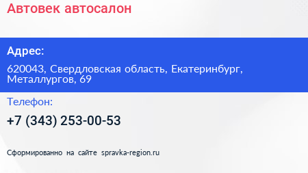 Автовек, автосалон по адресу 620043, Свердловская область, Екатеринбург, Металлургов, 69 в дальнейшем Организация, размещена в следующих категориях:
