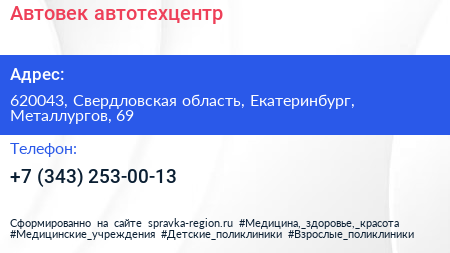 Автовек, автотехцентр по адресу 620043, Свердловская область, Екатеринбург, Металлургов, 69 в дальнейшем Организация, размещена в следующих категориях: