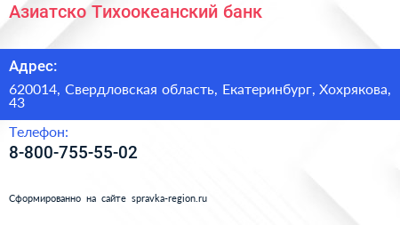 Азиатско-Тихоокеанский банк по адресу 620014, Свердловская область, Екатеринбург, Хохрякова, 43 в дальнейшем Организация, размещена в следующих категориях: