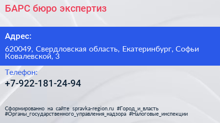 БАРС, бюро экспертиз по адресу 620049, Свердловская область, Екатеринбург, Софьи Ковалевской, 3 в дальнейшем Организация, размещена в следующих категориях: