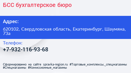 БСС, бухгалтерское бюро по адресу 620102, Свердловская область, Екатеринбург, Шаумяна, 73а в дальнейшем Организация, размещена в следующих категориях: