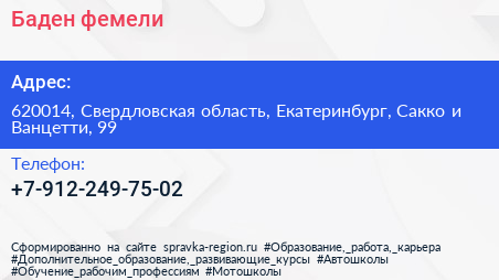 Баден фемели по адресу 620014, Свердловская область, Екатеринбург, Сакко и Ванцетти, 99 в дальнейшем Организация, размещена в следующих категориях: