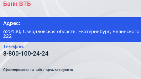 Банк ВТБ по адресу 620130, Свердловская область, Екатеринбург, Белинского, 222 в дальнейшем Организация, размещена в следующих категориях: