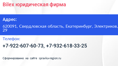 Bilex, юридическая фирма по адресу 620091, Свердловская область, Екатеринбург, Электриков, 29 в дальнейшем Организация, размещена в следующих категориях: