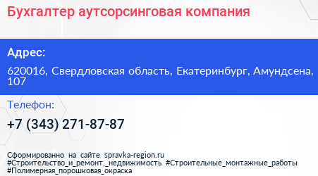 Для связи с организацией воспользуйтесь номером телефона: +7 (343) 271-87-87. Пн: c 09:00-18:00, Вт: c 09:00-18:00, Ср: c 09:00-18:00, Чт: c 09:00-18:00, Пт: c 09:00-18:00, Сб: выходной, Вс: выходной, вы можете обратиться в эту организацию.