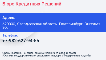 Бюро Кредитных Решений по адресу 620000, Свердловская область, Екатеринбург, Энгельса, 30а в дальнейшем Организация, размещена в следующих категориях: