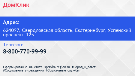 ДомКлик по адресу 624097, Свердловская область, Екатеринбург, Успенский проспект, 125 в дальнейшем Организация, размещена в следующих категориях: