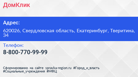 ДомКлик по адресу 620026, Свердловская область, Екатеринбург, Тверитина, 34 в дальнейшем Организация, размещена в следующих категориях: