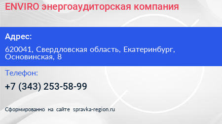 ENVIRO, энергоаудиторская компания по адресу 620041, Свердловская область, Екатеринбург, Основинская, 8 в дальнейшем Организация, размещена в следующих категориях: