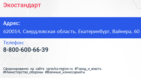 Экостандарт по адресу 620014, Свердловская область, Екатеринбург, Вайнера, 60 в дальнейшем Организация, размещена в следующих категориях:
