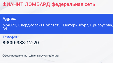 ФИАНИТ-ЛОМБАРД, федеральная сеть по адресу 624090, Свердловская область, Екатеринбург, Кривоусова, 34 в дальнейшем Организация, размещена в следующих категориях: