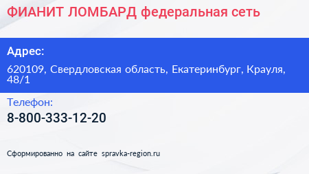 ФИАНИТ-ЛОМБАРД, федеральная сеть по адресу 620109, Свердловская область, Екатеринбург, Крауля, 48/1 в дальнейшем Организация, размещена в следующих категориях: