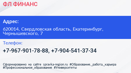 ФЛ-ФИНАНС по адресу 620014, Свердловская область, Екатеринбург, Чернышевского, 7 в дальнейшем Организация, размещена в следующих категориях: