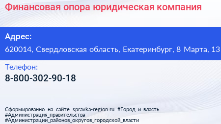 Финансовая опора, юридическая компания по адресу 620014, Свердловская область, Екатеринбург, 8 Марта, 13 в дальнейшем Организация, размещена в следующих категориях: