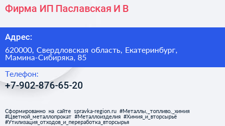 Фирма, ИП Паславская И.В. по адресу 620000, Свердловская область, Екатеринбург, Мамина-Сибиряка, 85 в дальнейшем Организация, размещена в следующих категориях: