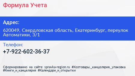 Формула Учета по адресу 620049, Свердловская область, Екатеринбург, переулок Автоматики, 3/1 в дальнейшем Организация, размещена в следующих категориях: