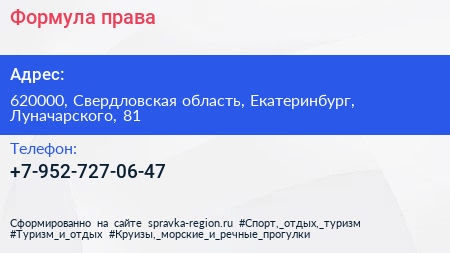 Формула права по адресу 620000, Свердловская область, Екатеринбург, Луначарского, 81 в дальнейшем Организация, размещена в следующих категориях: