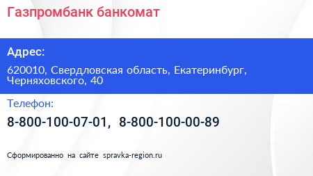 Газпромбанк, банкомат по адресу 620010, Свердловская область, Екатеринбург, Черняховского, 40 в дальнейшем Организация, размещена в следующих категориях: