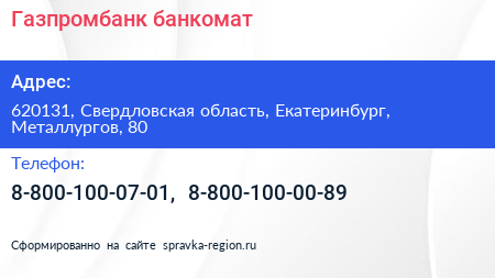 Газпромбанк, банкомат по адресу 620131, Свердловская область, Екатеринбург, Металлургов, 80 в дальнейшем Организация, размещена в следующих категориях: