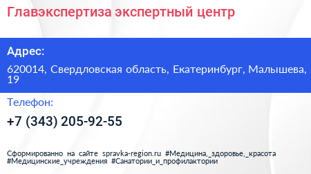 Главэкспертиза, экспертный центр по адресу 620014, Свердловская область, Екатеринбург, Малышева, 19 в дальнейшем Организация, размещена в следующих категориях: