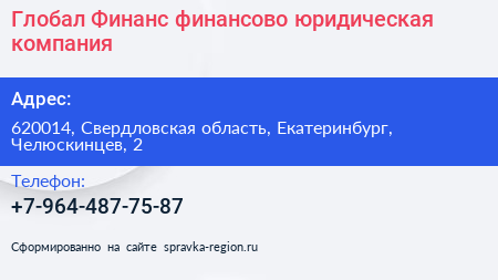 Глобал Финанс, финансово-юридическая компания по адресу 620014, Свердловская область, Екатеринбург, Челюскинцев, 2 в дальнейшем Организация, размещена в следующих категориях: