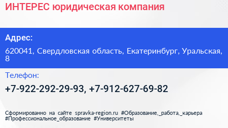 ИНТЕРЕС, юридическая компания по адресу 620041, Свердловская область, Екатеринбург, Уральская, 8 в дальнейшем Организация, размещена в следующих категориях: