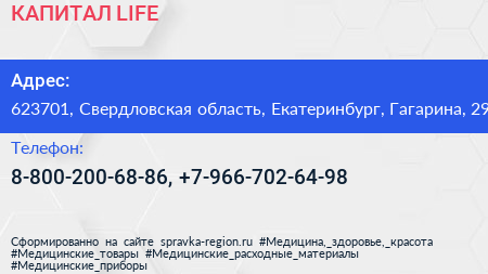 КАПИТАЛ LIFE по адресу 623701, Свердловская область, Екатеринбург, Гагарина, 29 в дальнейшем Организация, размещена в следующих категориях: