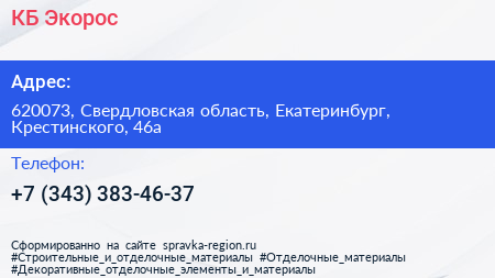 КБ Экорос по адресу 620073, Свердловская область, Екатеринбург, Крестинского, 46а в дальнейшем Организация, размещена в следующих категориях: